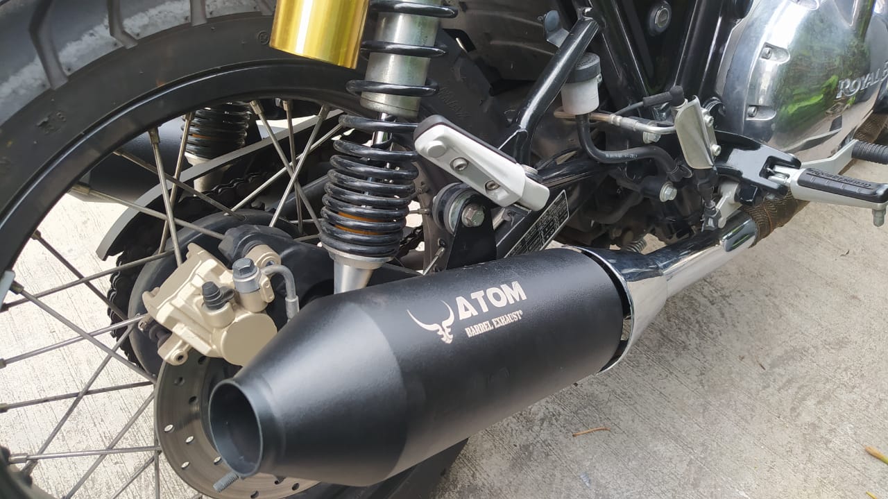 The Barret Exhaust Atom for RE Interceptor / GT 650 is perfect for Royal Enfield enthusiasts. Crafted from stainless steel, it offers an awesome sound and is 50% lighter than the original exhaust. It also comes in matte black and includes db killers. Upgrade your ride and experience the difference.